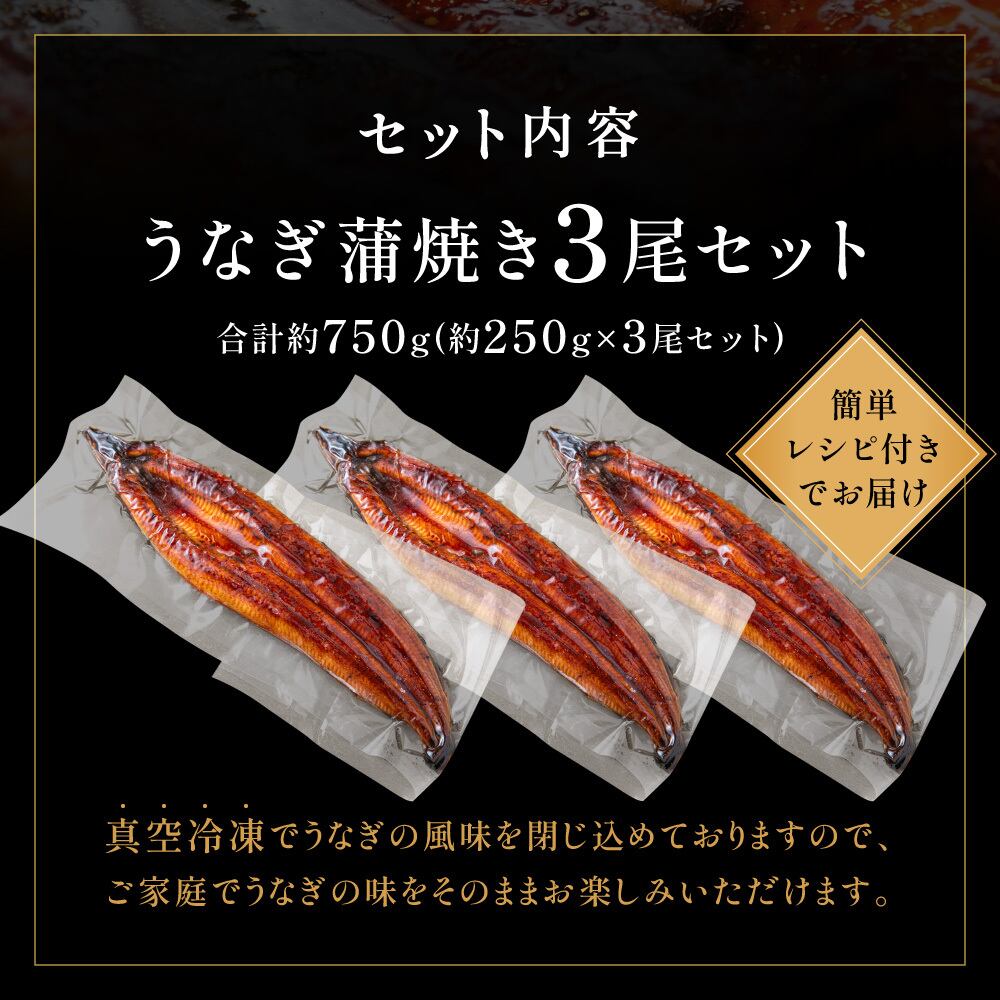 **特上うなぎ蒲焼き3尾(約250g×3尾/計約750g)**を組み合わせました。
